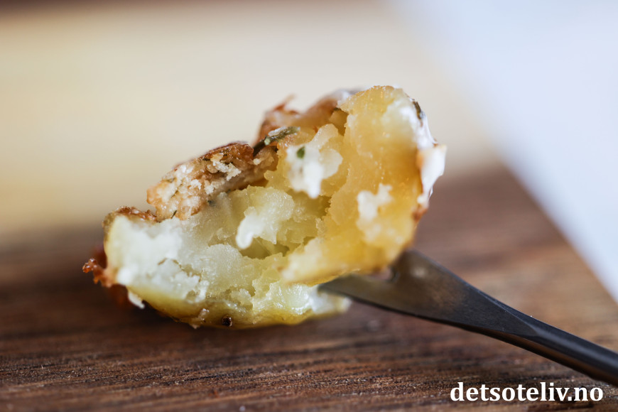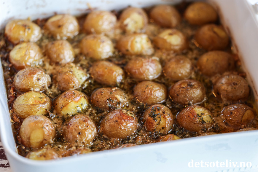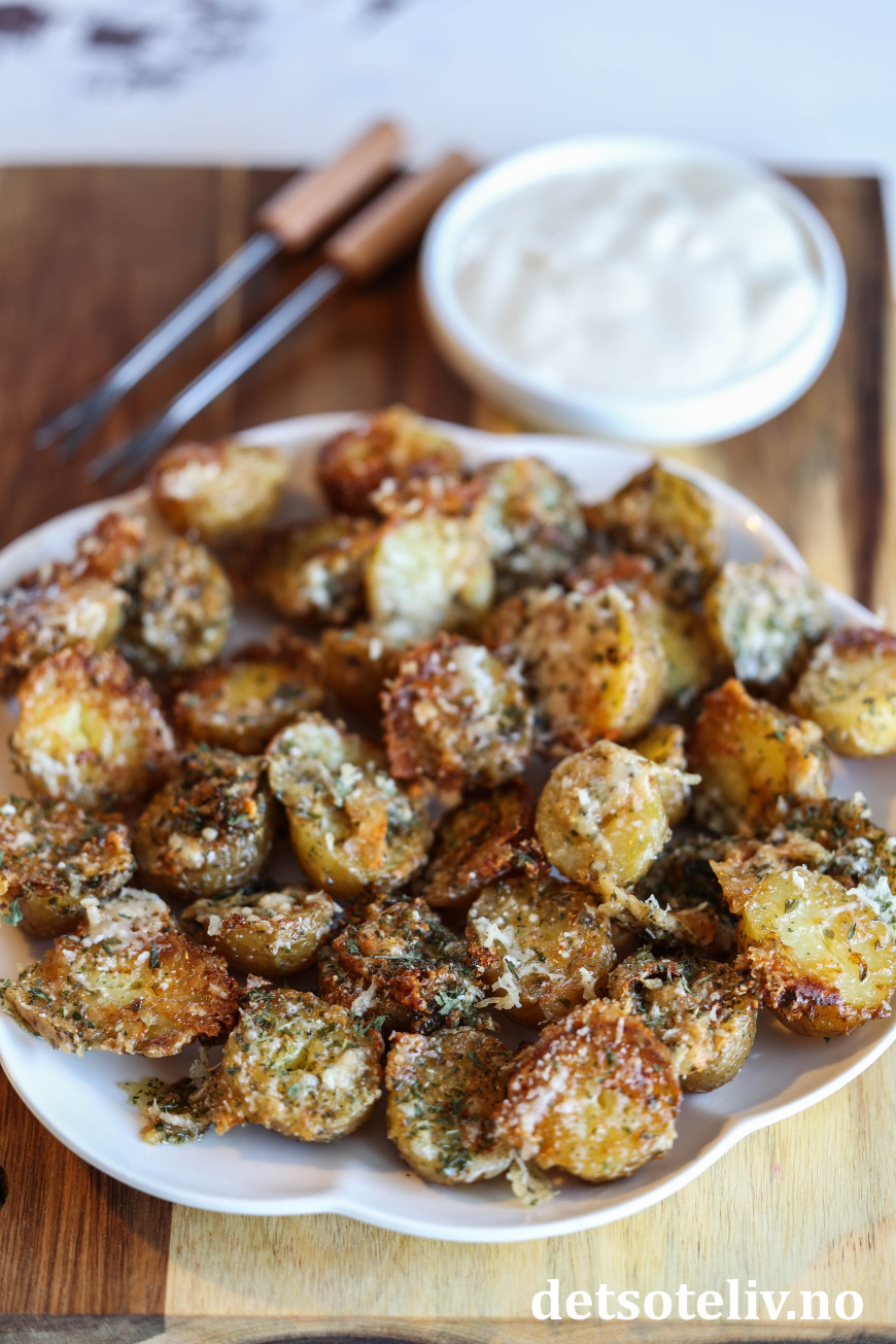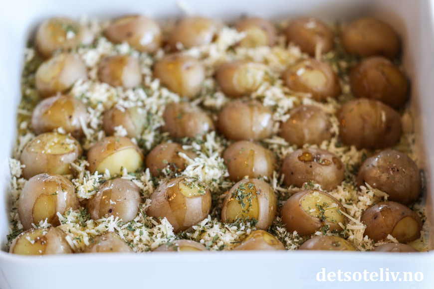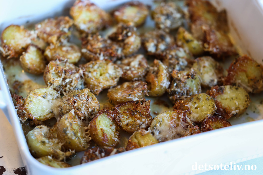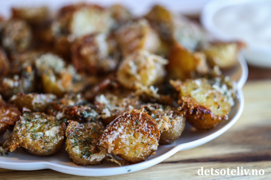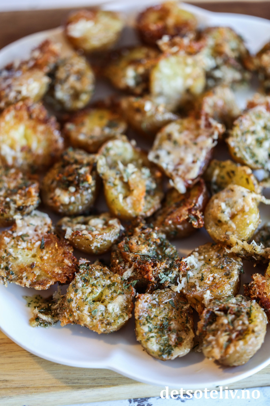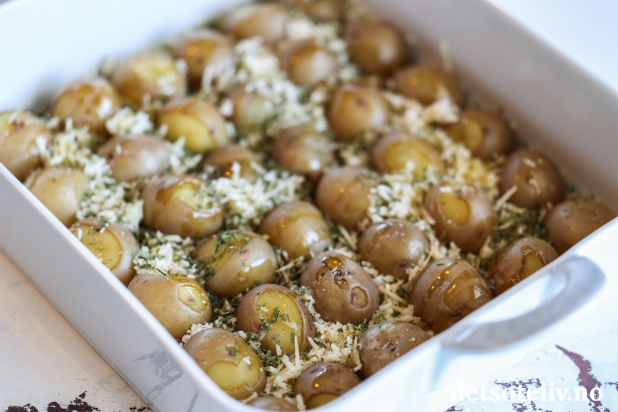 Her brukes små, delikate poteter, som først kokes møre, og deretter stekes i ovnen sammen med olivenolje, hvitløk, salt, urter og masse parmesan! Osten legger seg som et herlig, sprøtt lag utenpå de myke, varme potetbitene.