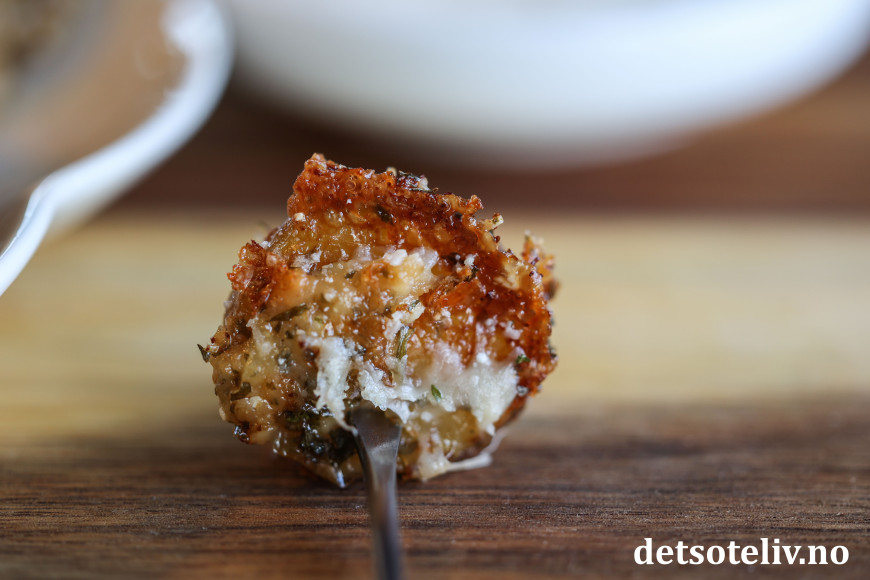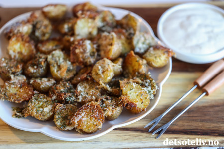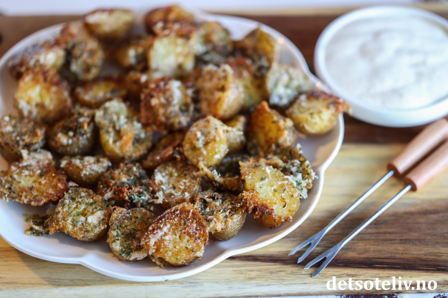 Server parmesanpotetene varme, gjerne med en god dipp.