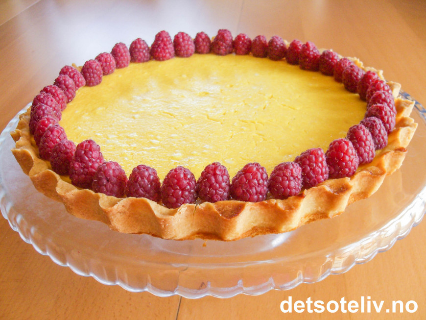 Før servering fjernes kantene på paiformen. Pynt kaken med deilige, friske bringebær.