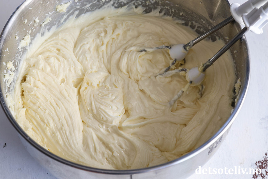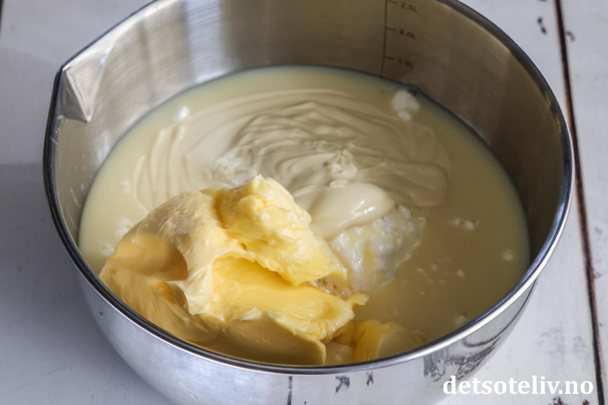 Ha melis og romtemperert smør i en bolle. Smelt hvit sjokolade (se tips) og tilsett sammen med søtet, kondensert melk (se tips).