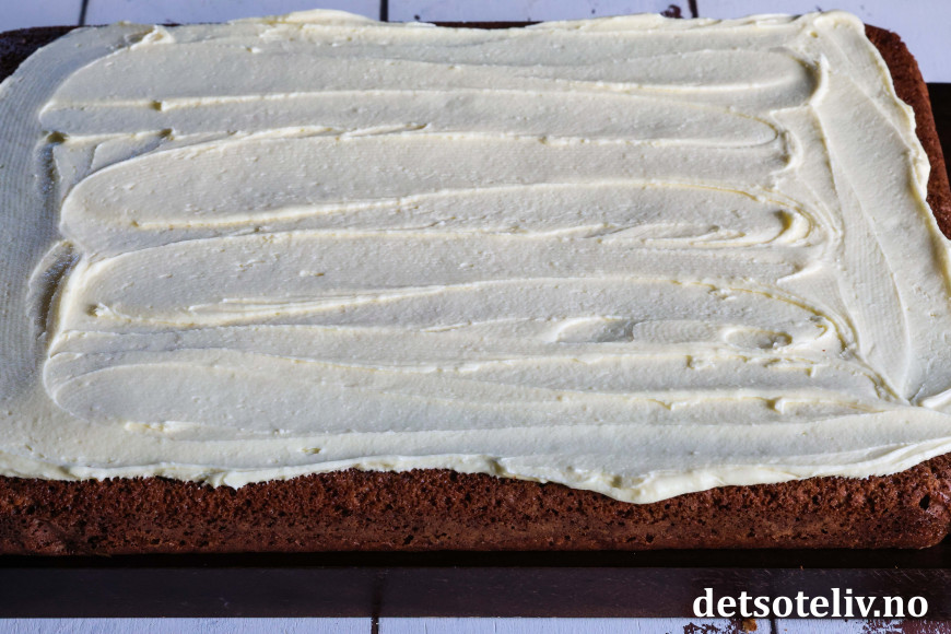 Jeg har tatt utgangspunkt i den supre oppskriften på Sjokoladekake med kefir (langpanne), og så toppet kaken med en kjempedigg melkekrem. Melkekremen består av en luftig smørkrem tilsatt søtet, kondensert melk og hvit sjokolade.