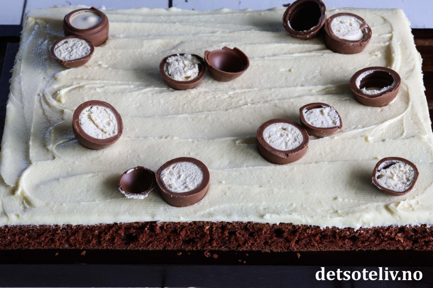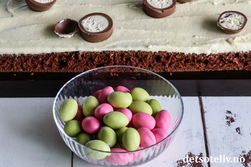 Pynt kaken med påskeegg, gjerne en blanding av miniegg, mandelegg og sjokoladeegg fylt med melkekrem.