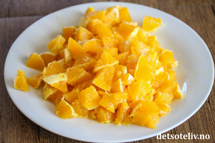 Del appelsinene opp i båter som så skjæres opp i små biter.
