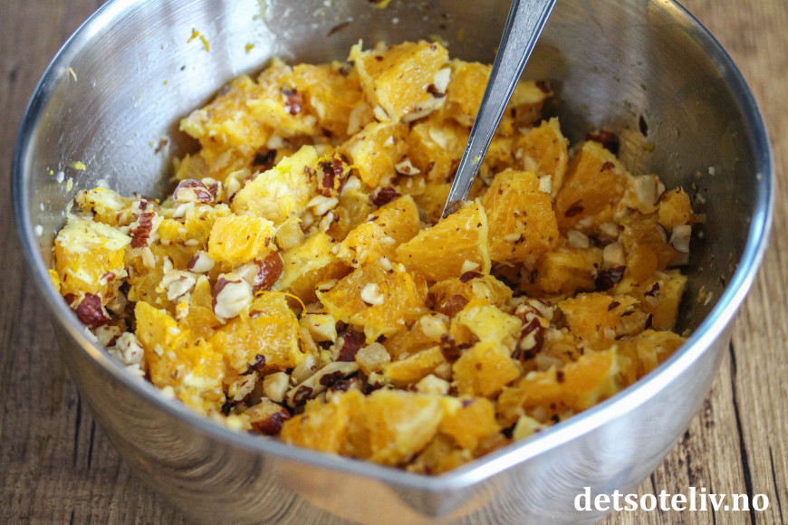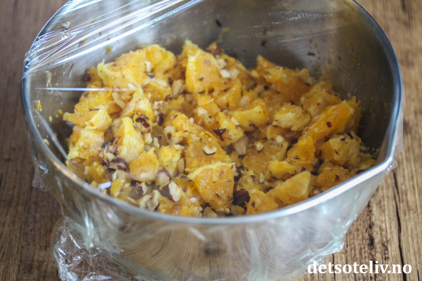 Riv av det ytterste skallet på appelsinene med et grovt rivjern. Skrell vekk rester av appelsinskallet. Del appelsinene opp i båter som så skjæres opp i små biter. Ha appelsinbitene og skallet i en bolle. Hakk nøttene (dette går raskt i food processor). Bland nøttene og apsikat med appelsinene. La dette stå i kjøleskapet over natten.