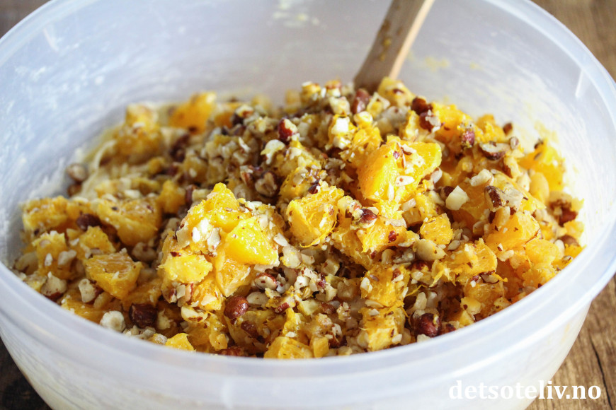 ♥ Dersom du ikke har tid til å vente på at appelsin- og nøtteblandingen står i kjøleskapet over natten, går det også greit å droppe dette og bare lage kaken med en gang.