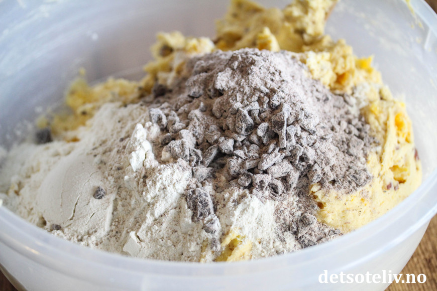 Hakk kokesjokoladen fint (dette går raskt i food processor). Bland sjokoladen og resten av melet inn i deigen.