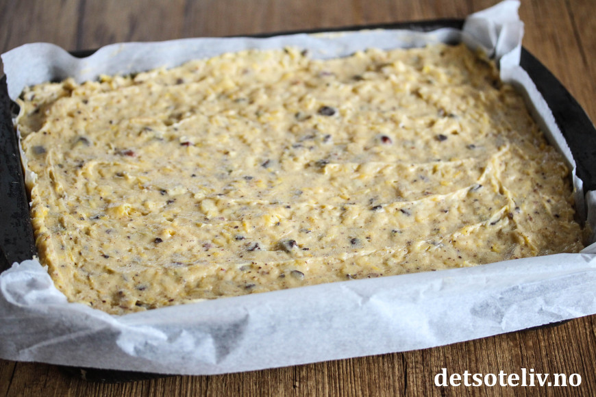 Ha deigen i en liten, bakepapirkledd langpanne (ca 20 x 30 cm) med høye kanter.