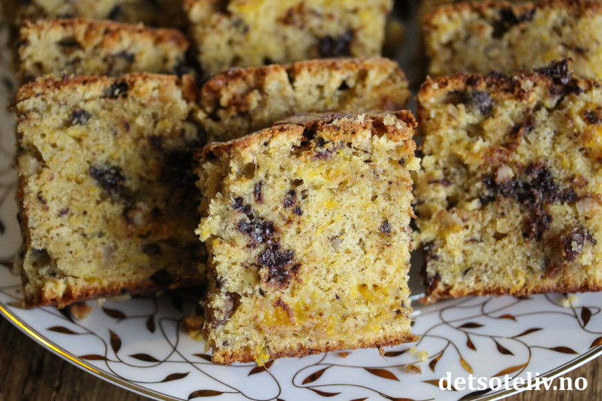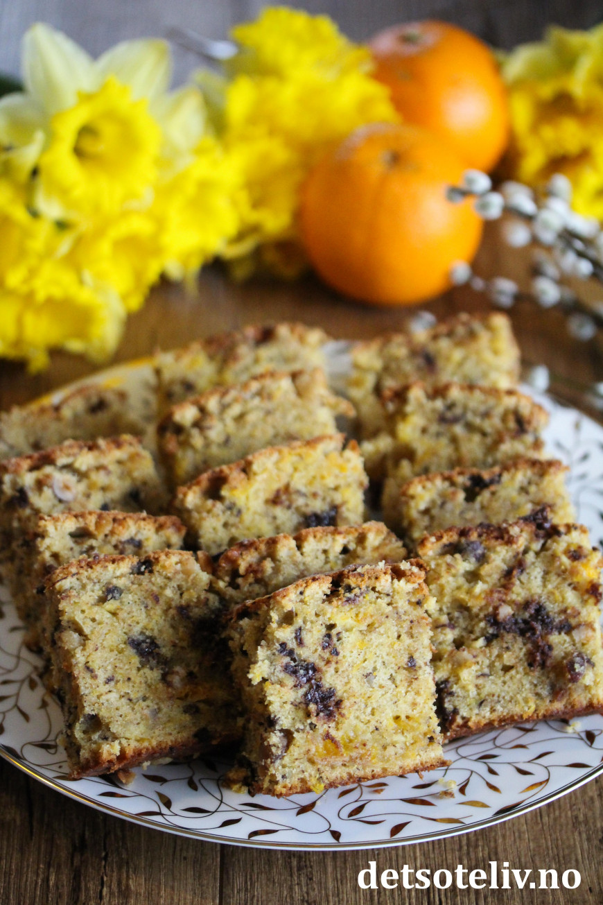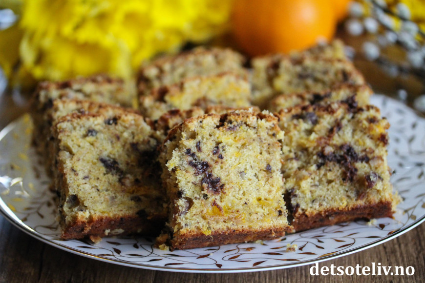 Dette er en nydelig og saftig formkake som inneholder små biter av appelsin, hakkede nøtter og sjokolade.