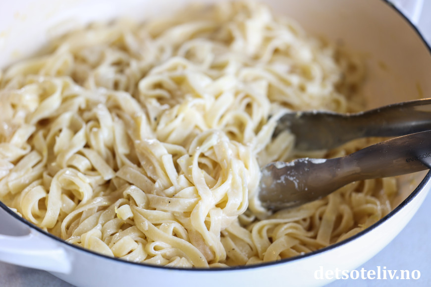 Når pastaen er kokt ferdig (så vidt al dente), løftes pastaen ut av kjelen og over i pannen med sitronsausen. Tilsett også ca. 1 dl av pastavannet.