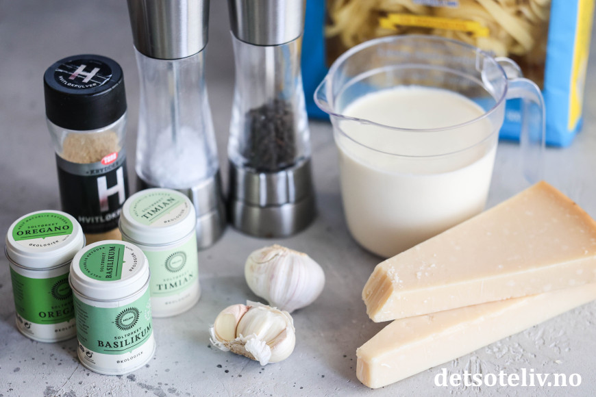 Riv parmesanosten fint og ha omtrent halvparten i fløtesausen. Rør så osten smelter.