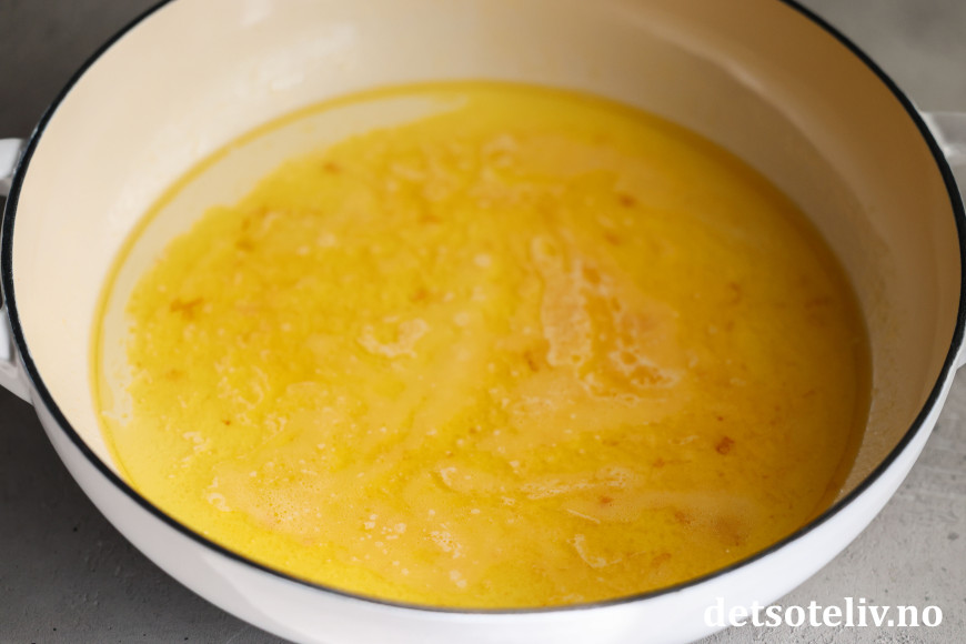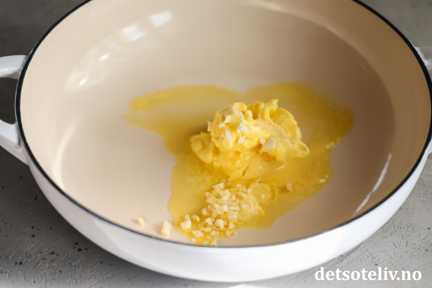 Ha smør og fint hakkede hvitløksfedd i en panne. Varm dette på middels varme i 1 - 2 minutter, slik at smøret tar god smak av hvitløken.