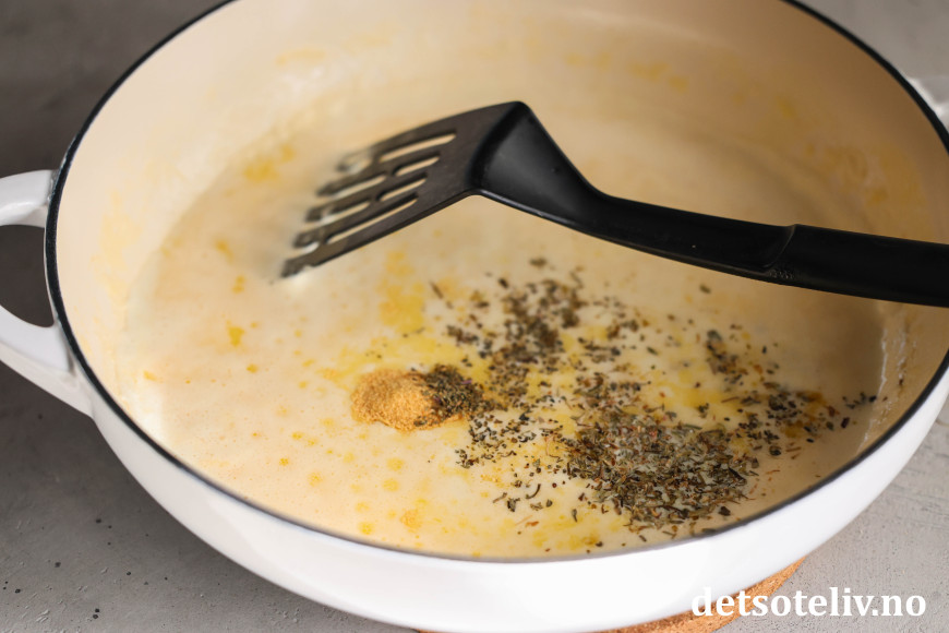 Tilsett hvitløkspulver og krydderurter.