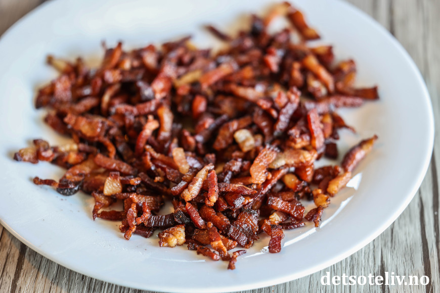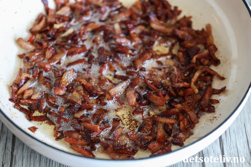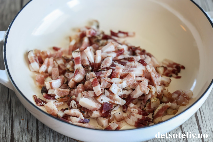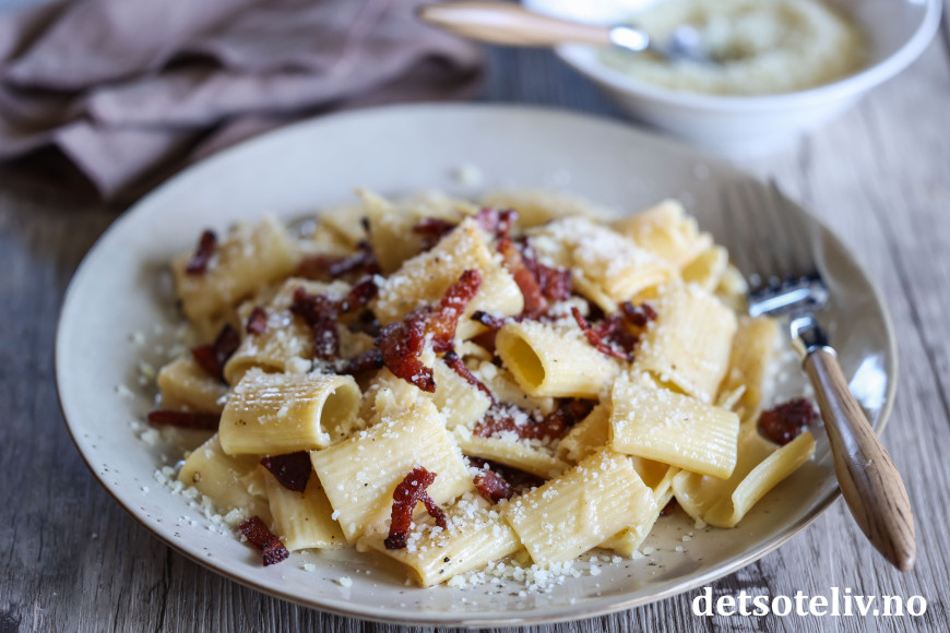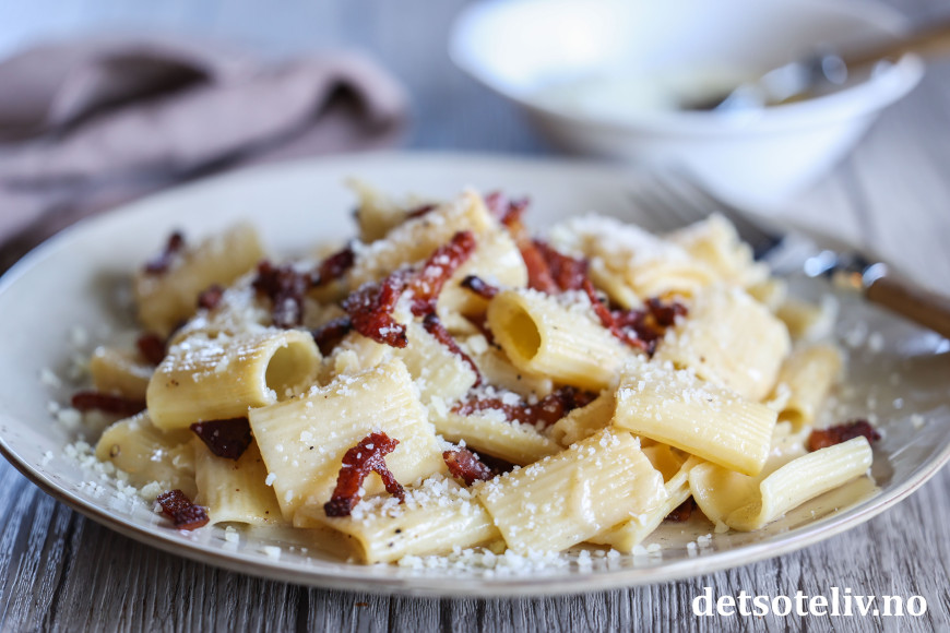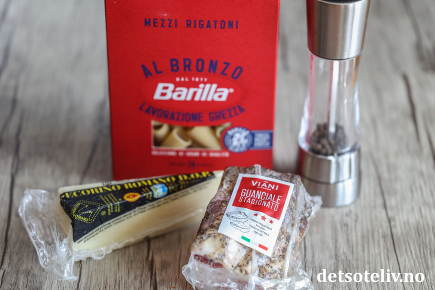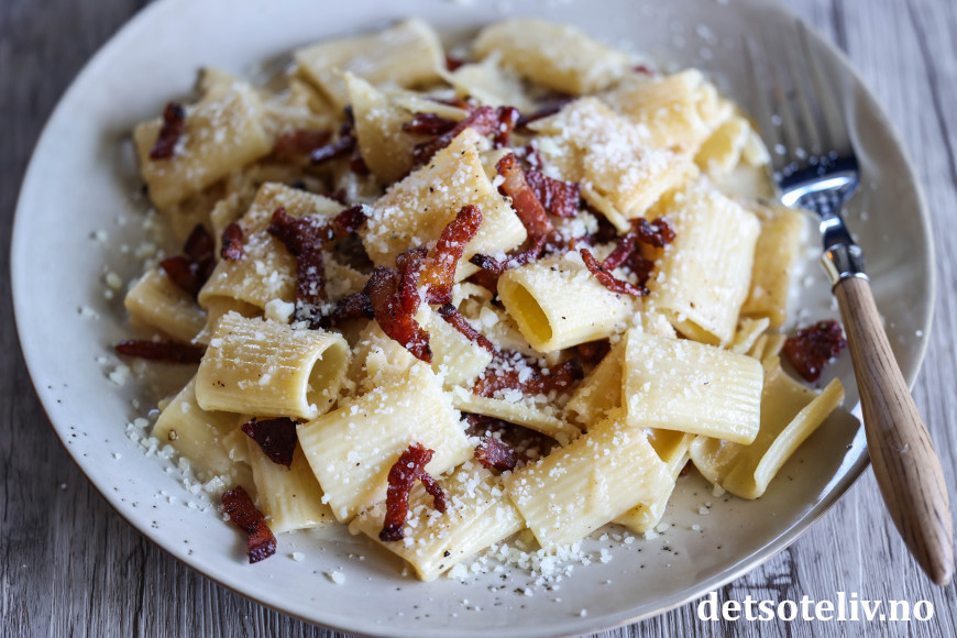 Dersom du ikke har ekte italiensk guanciale eller pancetta, går det også helt greit å bruke vanlig bacon, men bruk gjerne et stykke som du skjærer i små terninger i stedet for tynne baconskiver (selv om det selvsagt også blir bra).