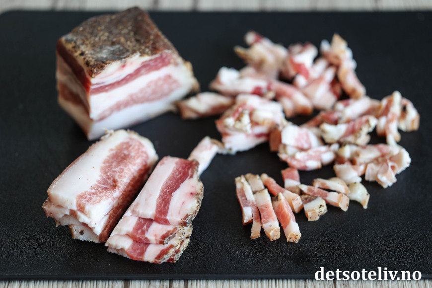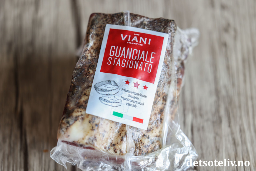 ♥ Guanciale er italiensk, speket svinekjake, som ser ut som et stykke bacon, men med ekstra mye fett. Veldig mye fett faktisk, men dette fettet smelter ved stekingen og gir veldig god smak på pastaretten. Alternativt brukes også ofte pancetta, som har noe mindre fett enn guanciale, men som ellers er nokså lik på smak. I motsetning til norsk bacon er hverken guanciale eller pancetta vanligvis røkt.