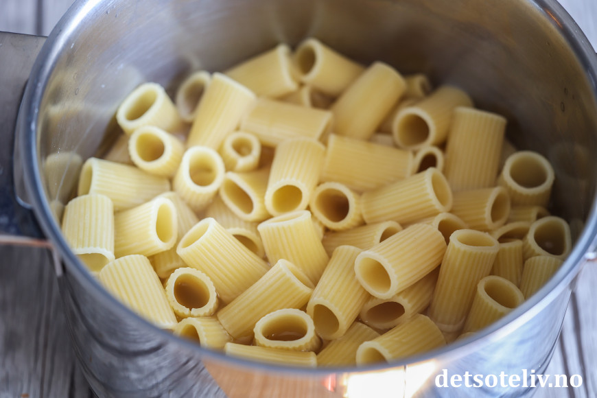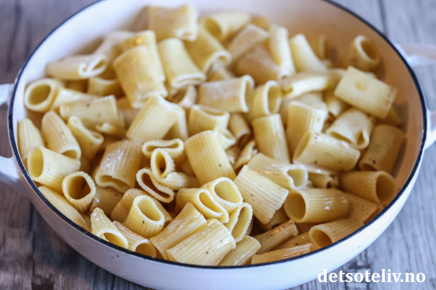 Kok rigatoni (eller annen type pasta) i godt saltet vann (bruk 1 ss salt per liter vann) som anvist på pakken, men la det stå igjen 1 - 2 minutter av koketiden (spar på pastavannet).