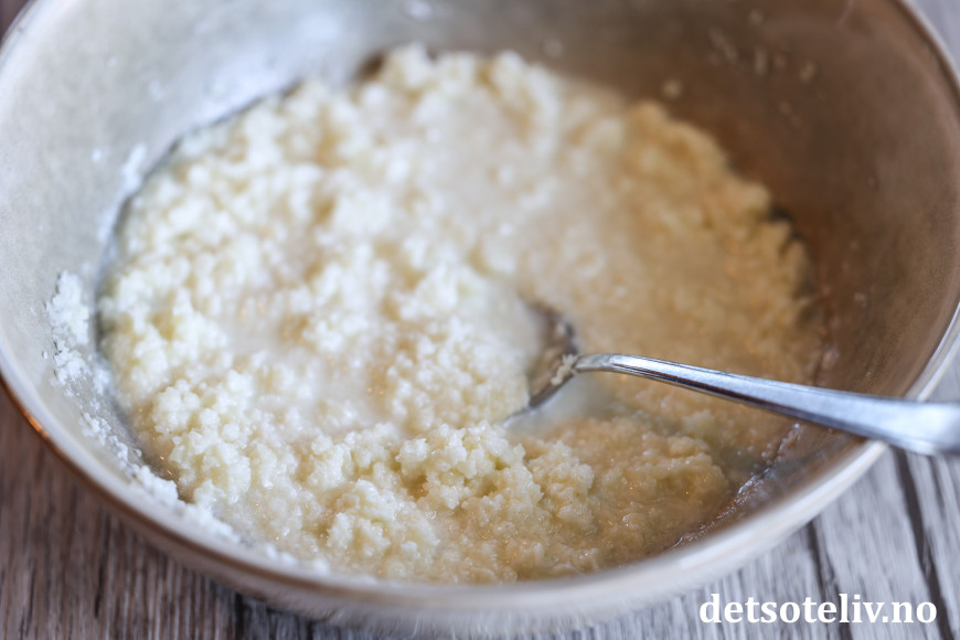 Ha omtrent 3/4 av den revne osten i en skål. Tilsett ca. 1 dl pastavann og rør dette sammen til en grøt.
