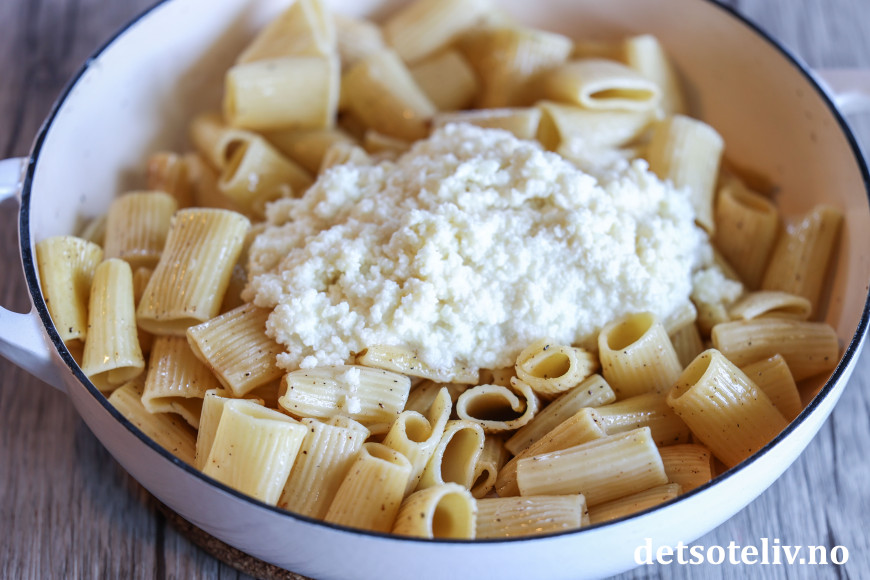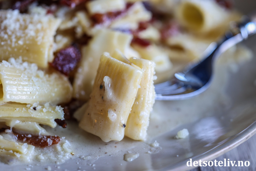 ♥ Jeg har ikke angitt mengde pastavann du skal bruke i sausen, for det må du tilpasse selv. Hvis du synes at osten ikke smelter skikkelig, hjelper det som regel å tilsette litt ekstra varmt pastavann. Rør litt (bruk gjerne slikkepott), men ikke så mye at pastaen går i stykker.