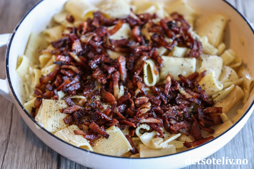 Ha pastaen over i stekepannen sammen med ca. 0,5 dl pastavann. Kvern over pepper. Bland pastaen med fettet i pannen.