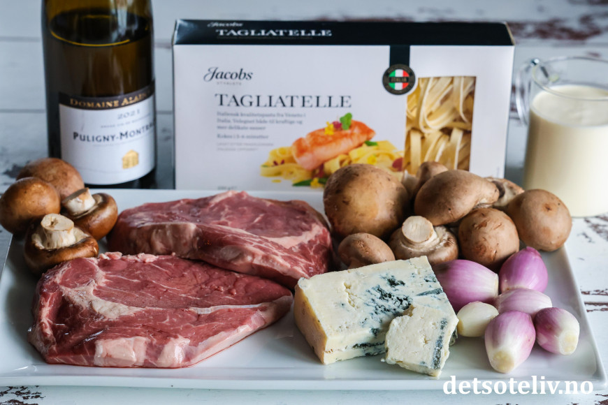 Her er en versjon med tagliatelle i en kremet gorgonzolasaus. I tillegg til blåmuggosten gorgonzola inneholder sausen stekt sopp, løk, hvitløk, fløte og hvitvin. Oppå pastaen legger man skiver av entrecõte. Pastaretten toppes med revet parmesan og frisk basilikum.