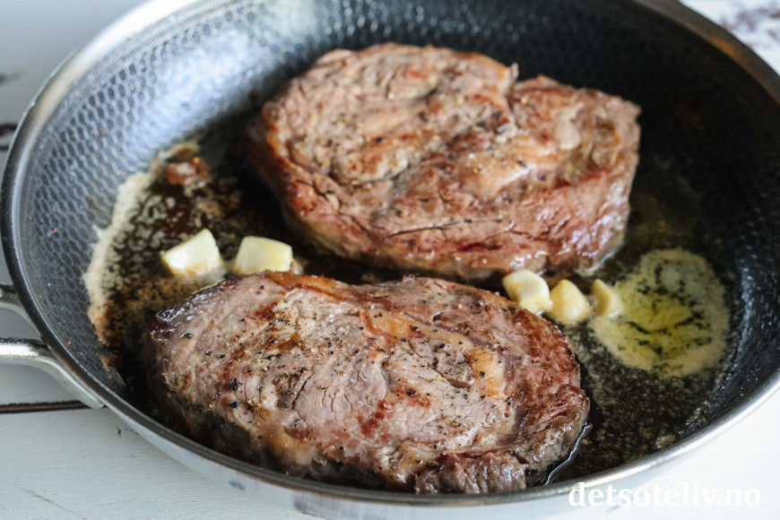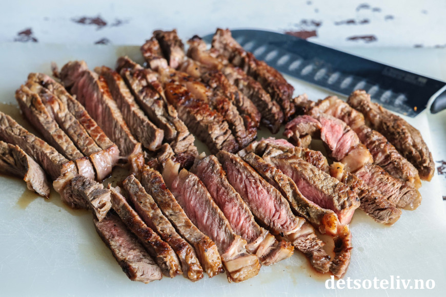 ♥ Jeg har her brukt entrecôte, som er saftig og smakfullt kjøtt å bruke som biffer. Du kan alternativt bruke ytrefilet av storfe eller annet biffkjøtt du liker. Følg med under stekingen av kjøttet slik at biffene blir passe gjennomstekte etter din smak. Det er viktig at kjøttet får hvile i 15 minutter før du skjærer det i skiver, slik at kjøttet bevarer saftigheten.
