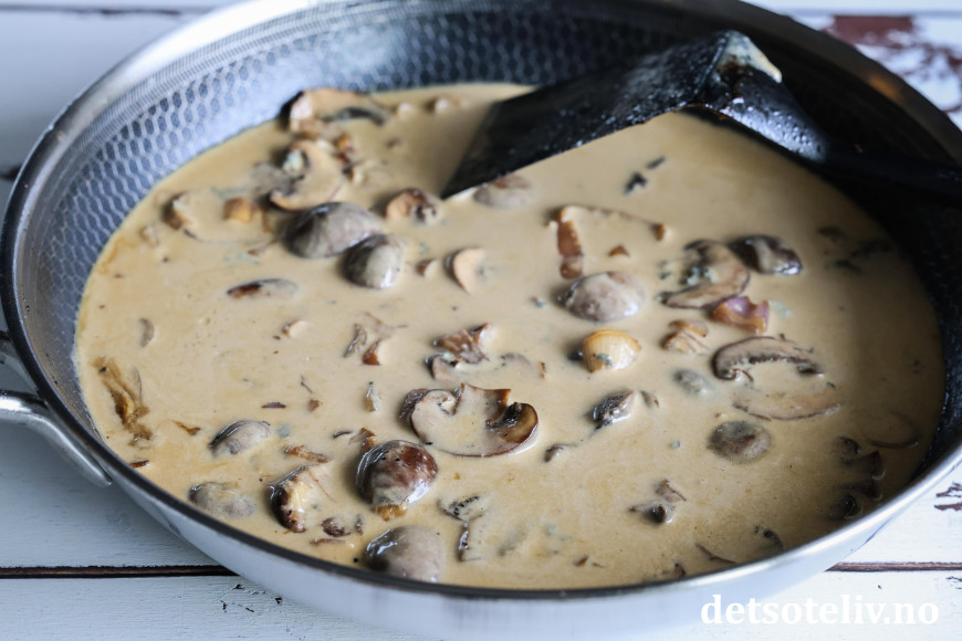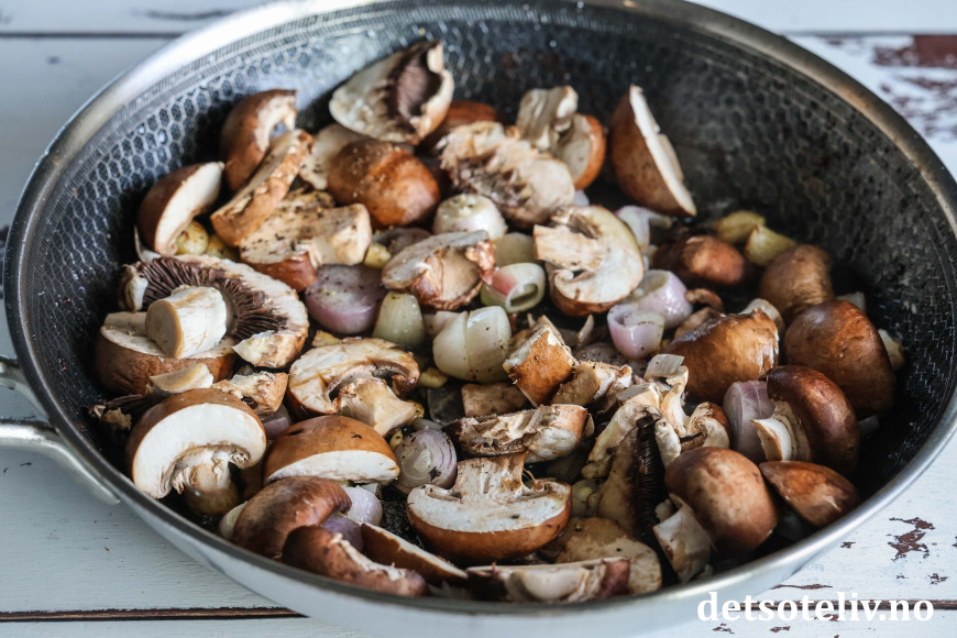 Til sausen smeltes smøret i den sammen pannen som du stekte kjøttet i (så du får med de gode smakene fra kjøttet). Tilsett hakket løk, hvitløk og sopp som er skjært i tykke skiver.