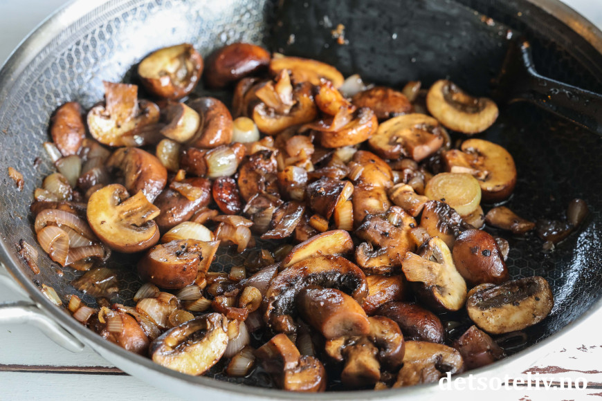 La dette steke på middels varme i et par minutter slik at løken og soppskivene blir myke og nokså godt stekt stekt.