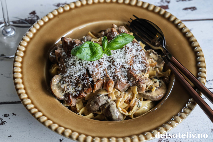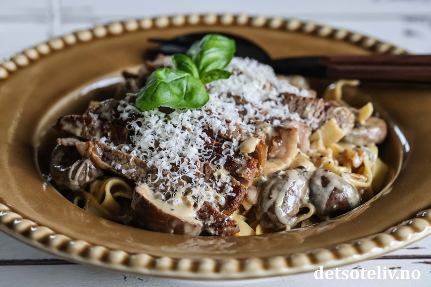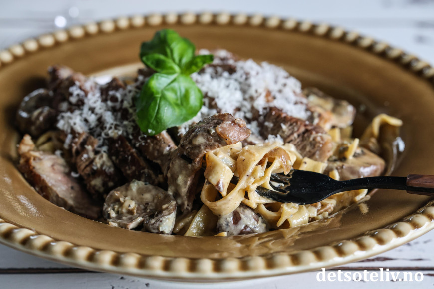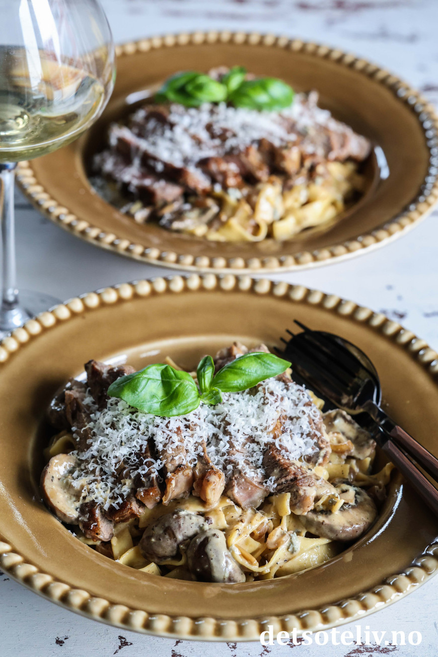 Server pastaretten varm og nylaget, med skiver av entrecôte oppå.