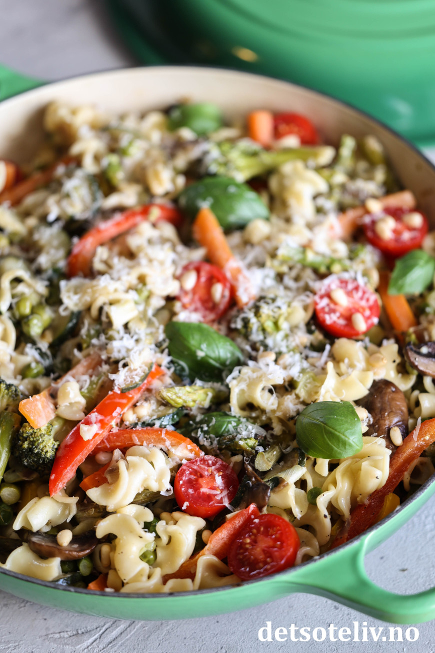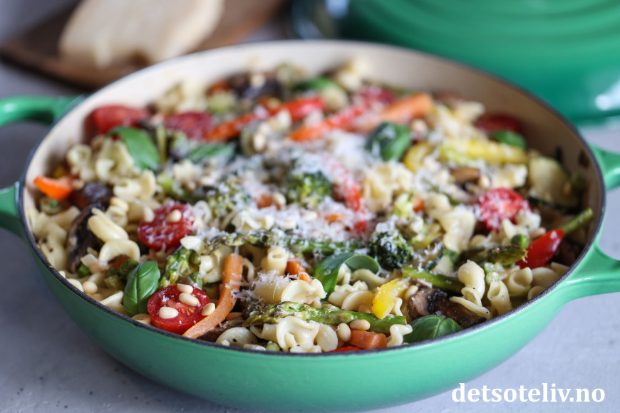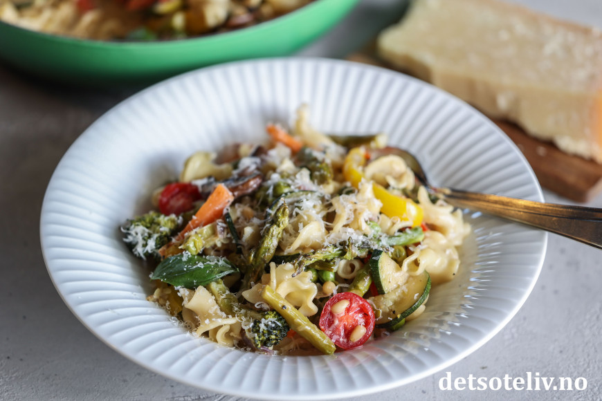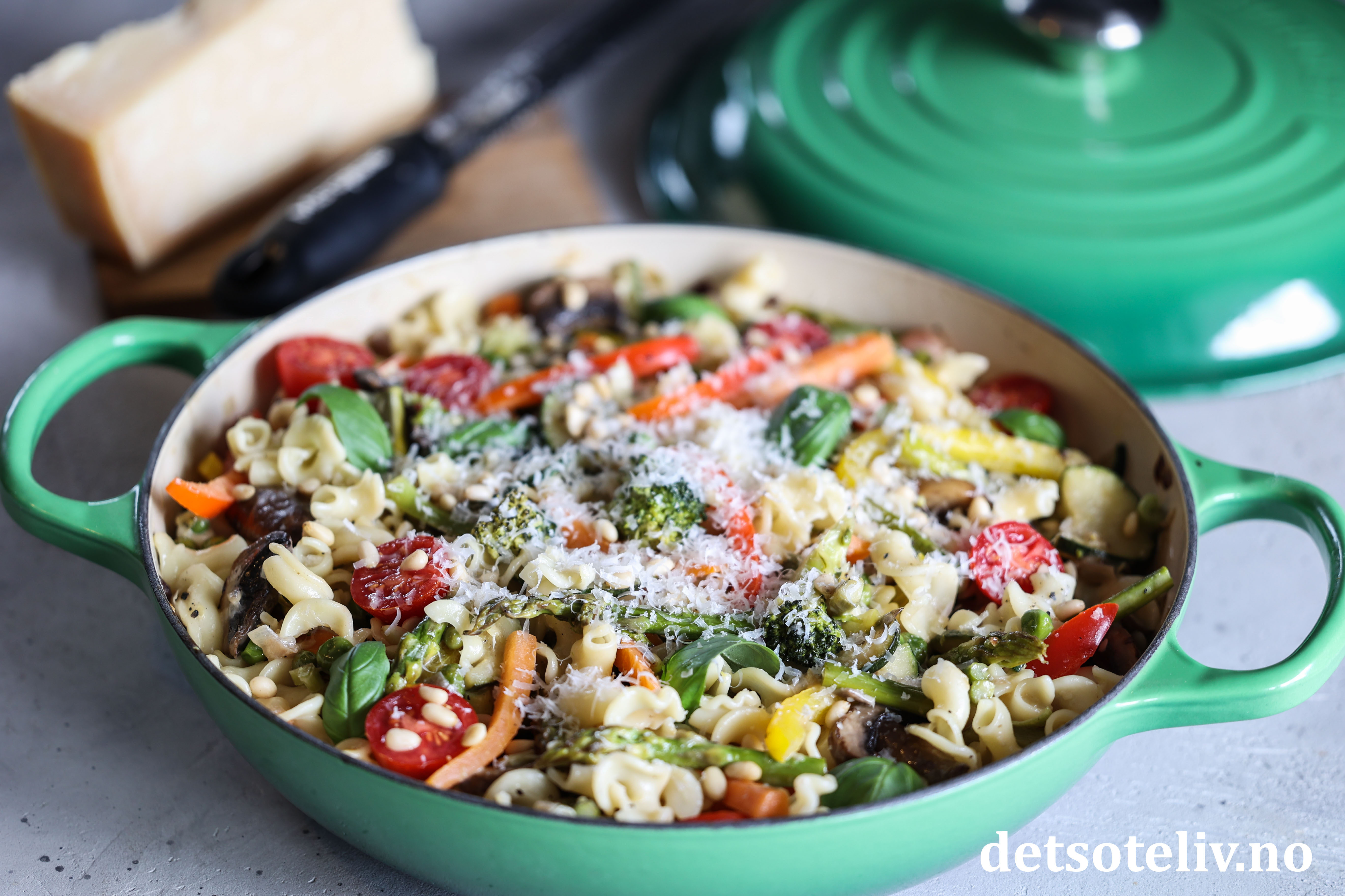 Hvis du vil få i deg 10 grønnsaker i en eneste smakfull middag, er et godt tips å lage en deilig Pasta Giardino! 😃