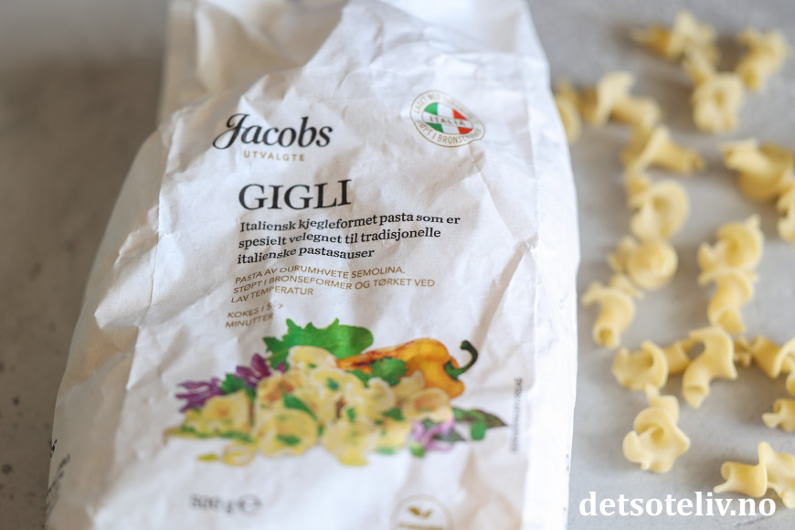 Jeg bruker her pastafasongen gigli (kalles også for campanelle eller trompetti) som er liljeformet / trompetformet, og som gir pastaretten et vakkert og lekent utseende.