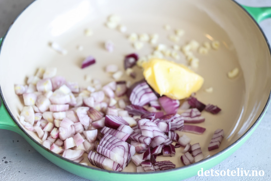Finn frem en stor stekepanne. Ha smør i pannen og tilsett hakket sjalottløk, rødløk og hvitløk.