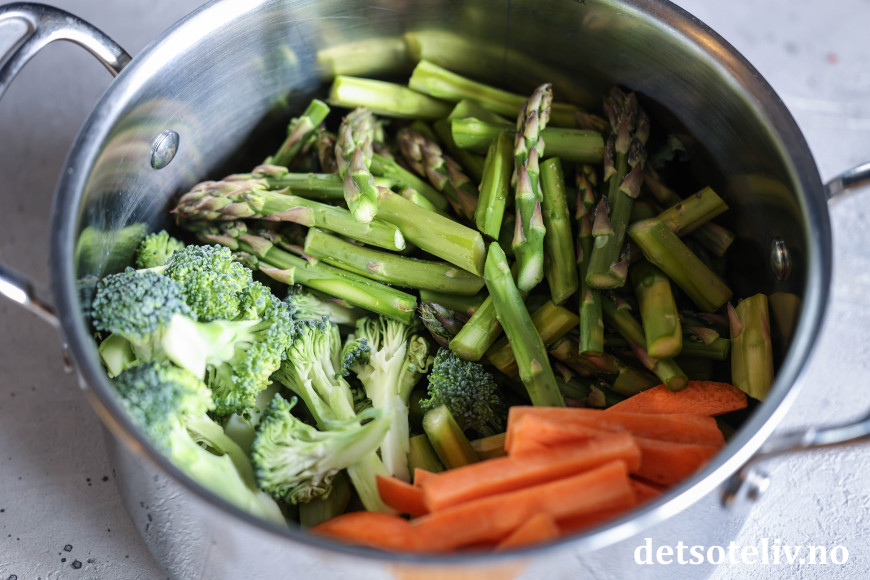 Rens asparges, brokkoli og gulrot og skjær i mindre biter. Legg dem i en kjele.