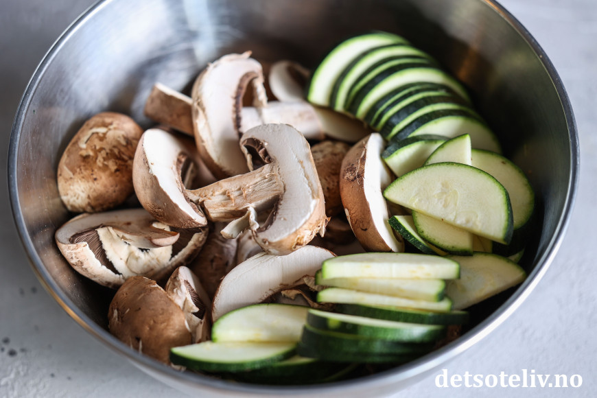 Skjær squash og sopp i skiver. Ha dette i pannen og la det steke på middels varme sammen med løken.