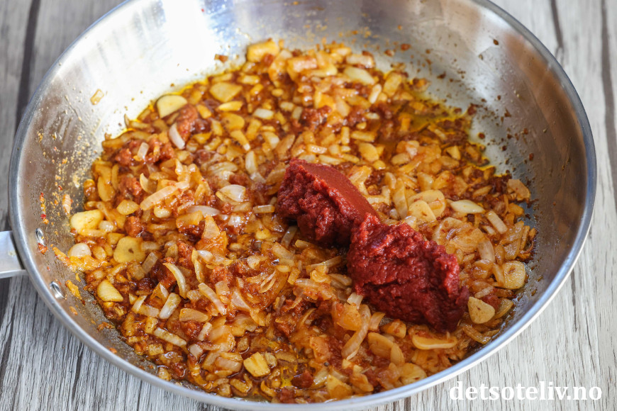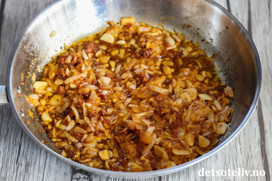 Ha olje i en panne og tilsett fint hakket løk og hvitløk. La dette steke på middels varme i et par minutter, til løken blir gyllen.