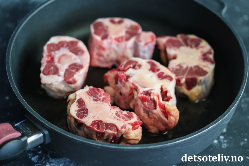 Stek oksehalestykkene i en stekepanne med olivenolje. Ikke ha alle stykkene i pannen på en gang, så stek dem i flere omganger.