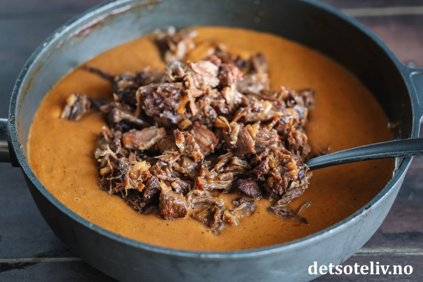 Kjør sausen i pannen glatt med en stavmikser. Smak til sausen om det trengs litt mer salt og pepper. Ha oksehalekjøttet i sausen. Vend kjøttet godt inn i sausen.