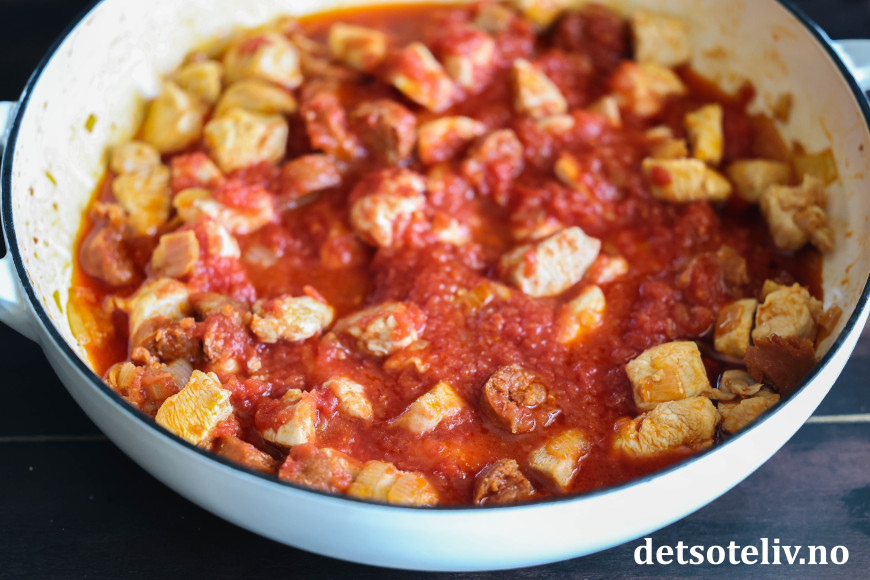 Tilsett en boks finhakkede tomater. Tilsett kremfløte og hvitvin (eller hvitvinseddik). La dette småkoke i ca. 5 minutter.
