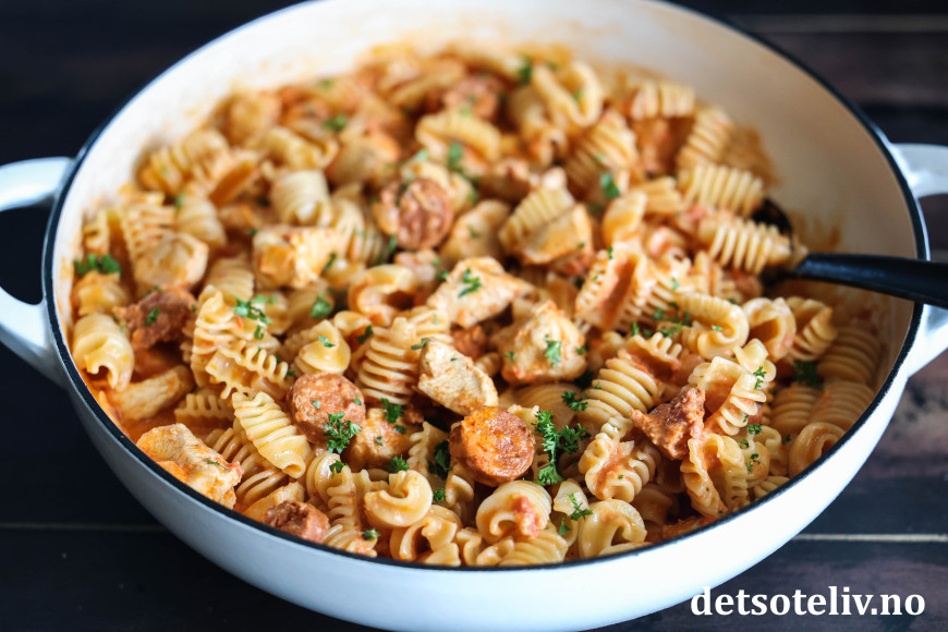 Valgfri type pasta has her i samme gryte som stekte kyllingbiter og chorizopølse. Kyllingfilet er jo mild på smak, og passer derfor veldig godt å kombinere med den mer kraftige chorizopølsen. Det hele vendes sammen i en nydelig saus basert på tomat, løk, hvitvin og fløte.