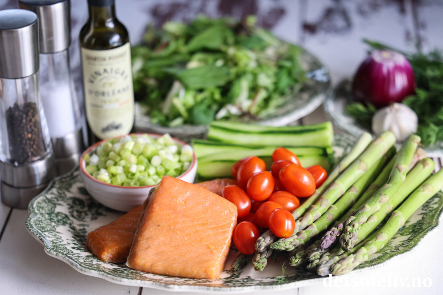 Den smakfulle laksen er nydelig i kombinasjon med asparges, vårløk, rødløk, agurk, cherrytomater og dill.