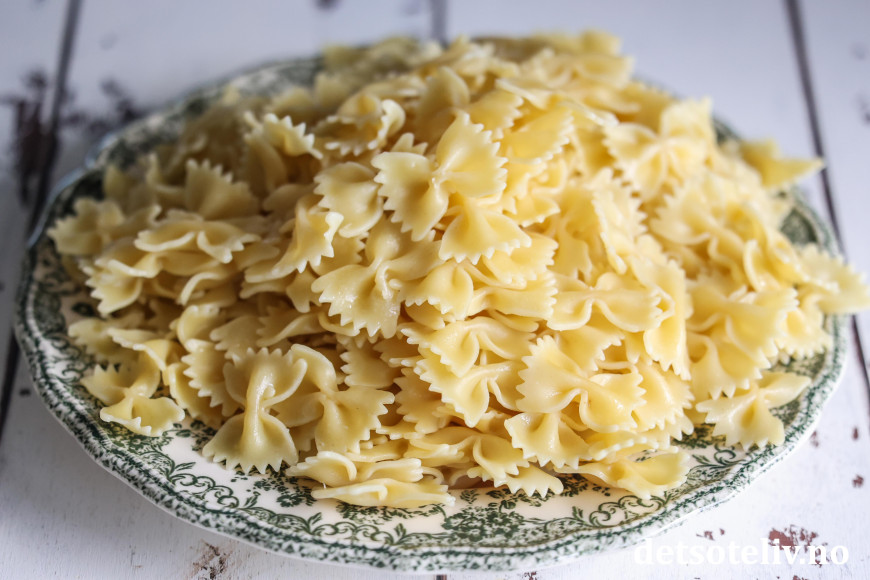 ♥ Jeg brukte her farfalle (pastasløyfer), men andre fasonger pasta kan selvfølgelig også brukes. Merk at 400 g er tørrvekt før koking.