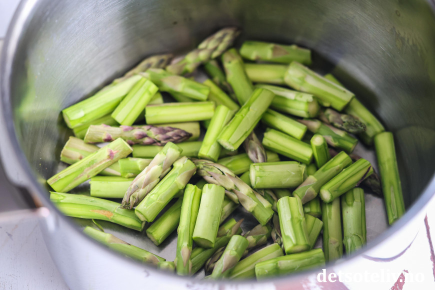 Rens asparges med en potetskreller, og skjær dem i store biter. Legg bitene i en kjele.