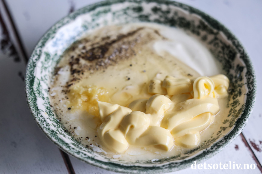 Rør sammen ingrediensene til dressingen. Smak til med kvernet salt og pepper.
