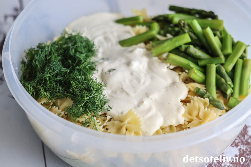 Kutt opp dill. Ha småbladsalat, pasta, asparges, dressing og dill i en stor rørebolle.