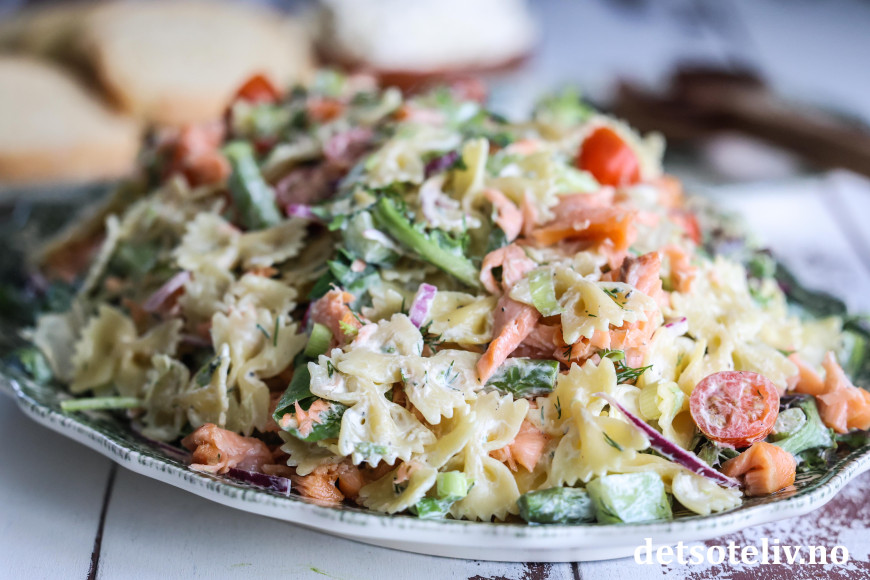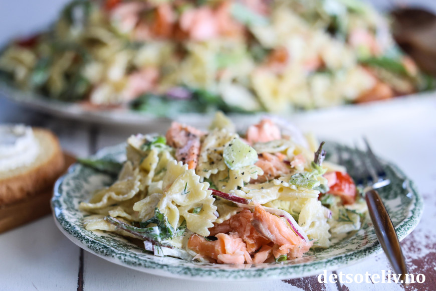 Her har du en herlig og sommerlig pastasalat med varmrøkt laks!