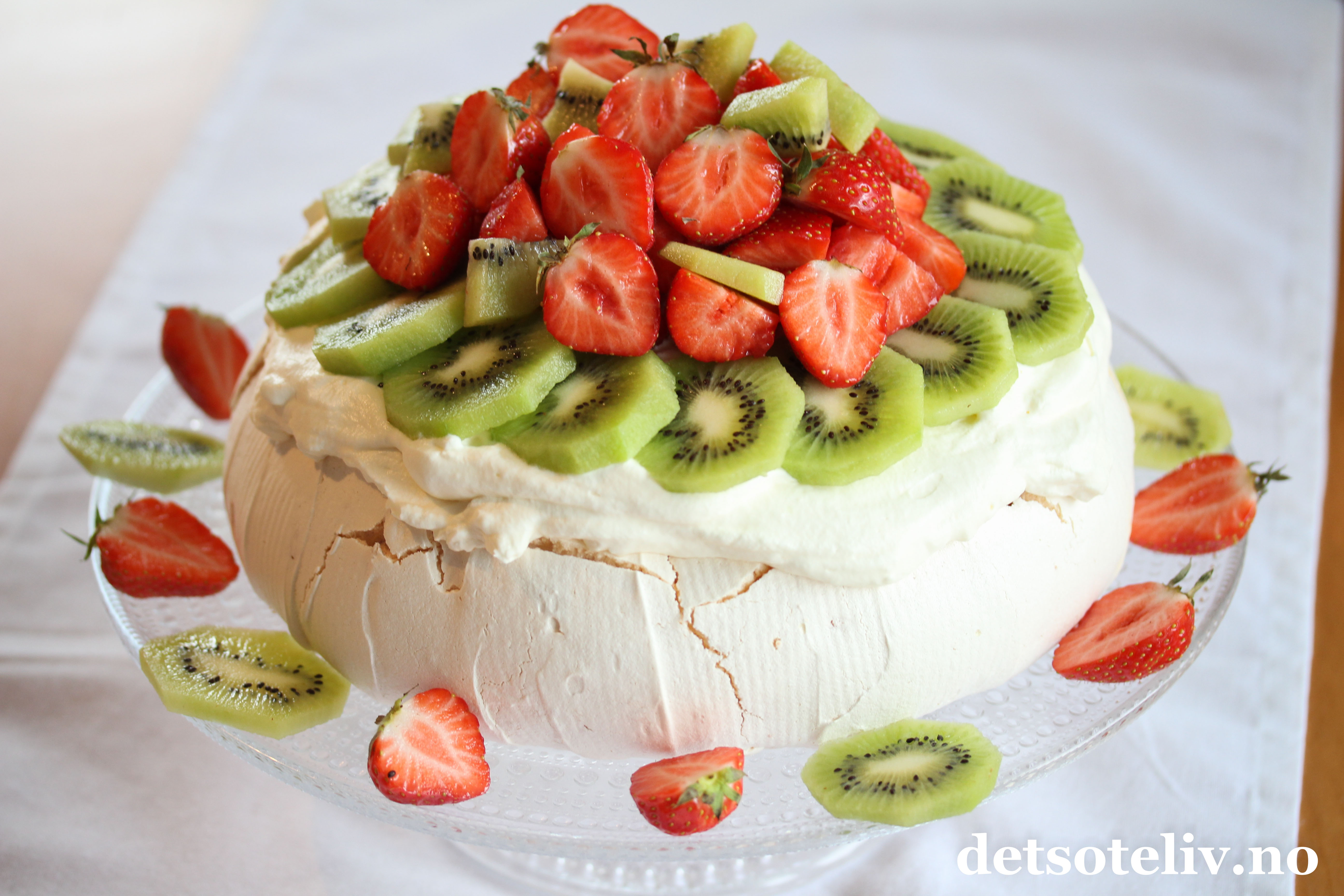 En Pavlova kan pyntes med bær eller frukt etter ønske, og du finner mange Pavlova-varianter her på detsoteliv.no. Den opprinnelige, australske Pavlovakaken pyntes tradisjonelt med søte, røde jordbær og frisk, grønn kiwifrukt.