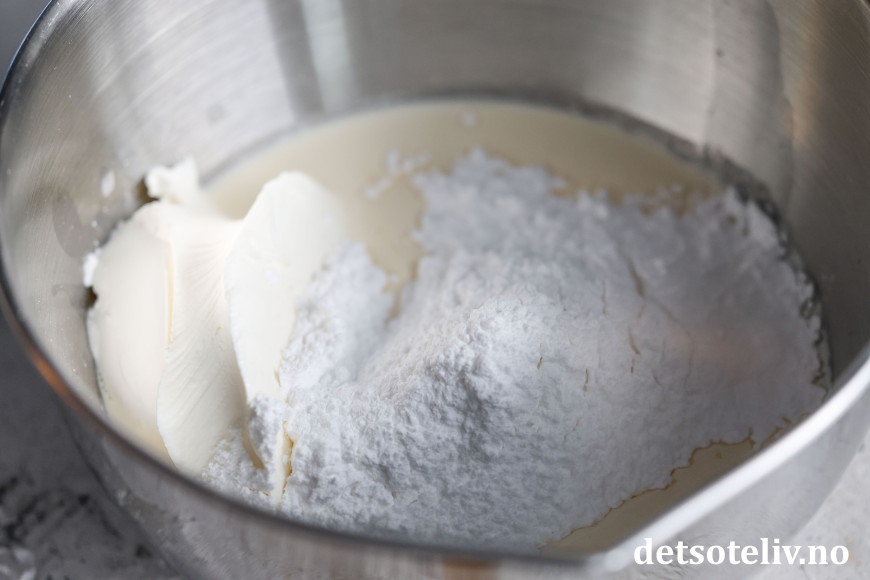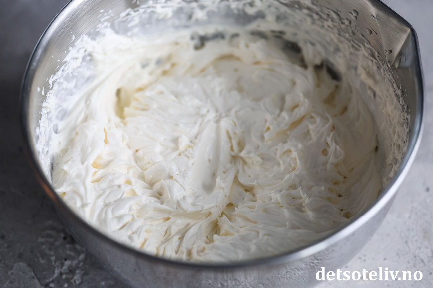 Ha kremfløte, mascarponeost og melis i en bolle og pisk til du får en tykk krem. Bland inn vanilje.