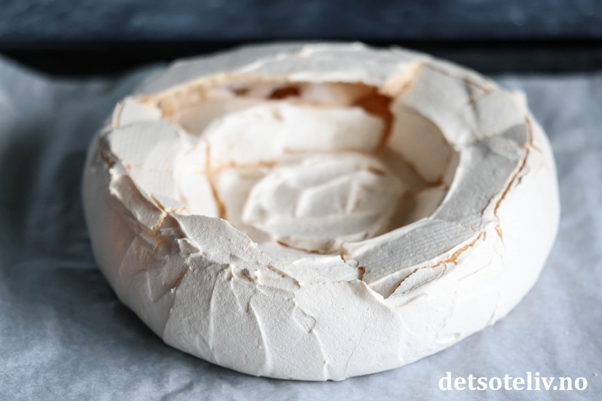 Tegn opp en sirkel på ca 22 cm i diameter på et bakepapir. Fordel marengsen innenfor sirkelen slik at du får enn liten, tykk kake. Bruk slikkepotten og jevn til kantene ved å dra slikkepotten nedenfra og opp. Glatt til overflaten og lag en grop på toppen av kaken (se tips).