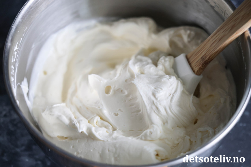 Ha kremfløte, mascarponeost og melis i en bolle og pisk til du får en tykk krem. Bland inn vanilje.