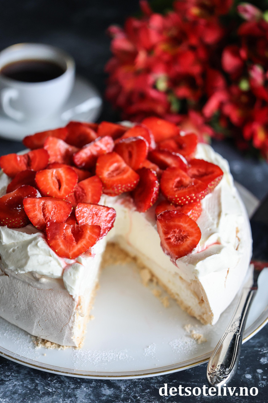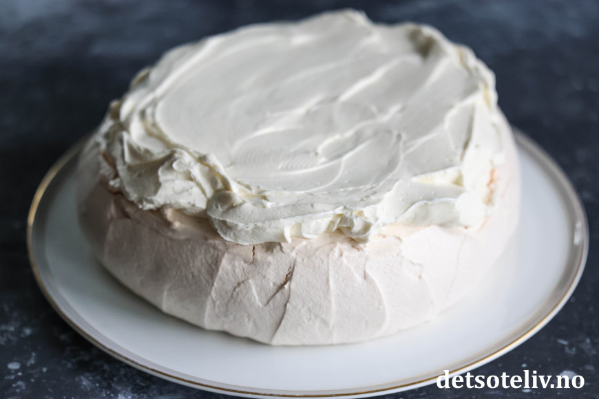 ♥ Sammenligner du denne kaken med Pavlova med mascarponekrem, bjørnebær og granateple, ser du at jeg her har laget en litt mindre kake. Det er begrunnelsen for at jeg har halvert mengden kremfløte i mascarponekremen. Dette gjør mascarponekremen litt tykkere, men den blir kremete og nydelig!