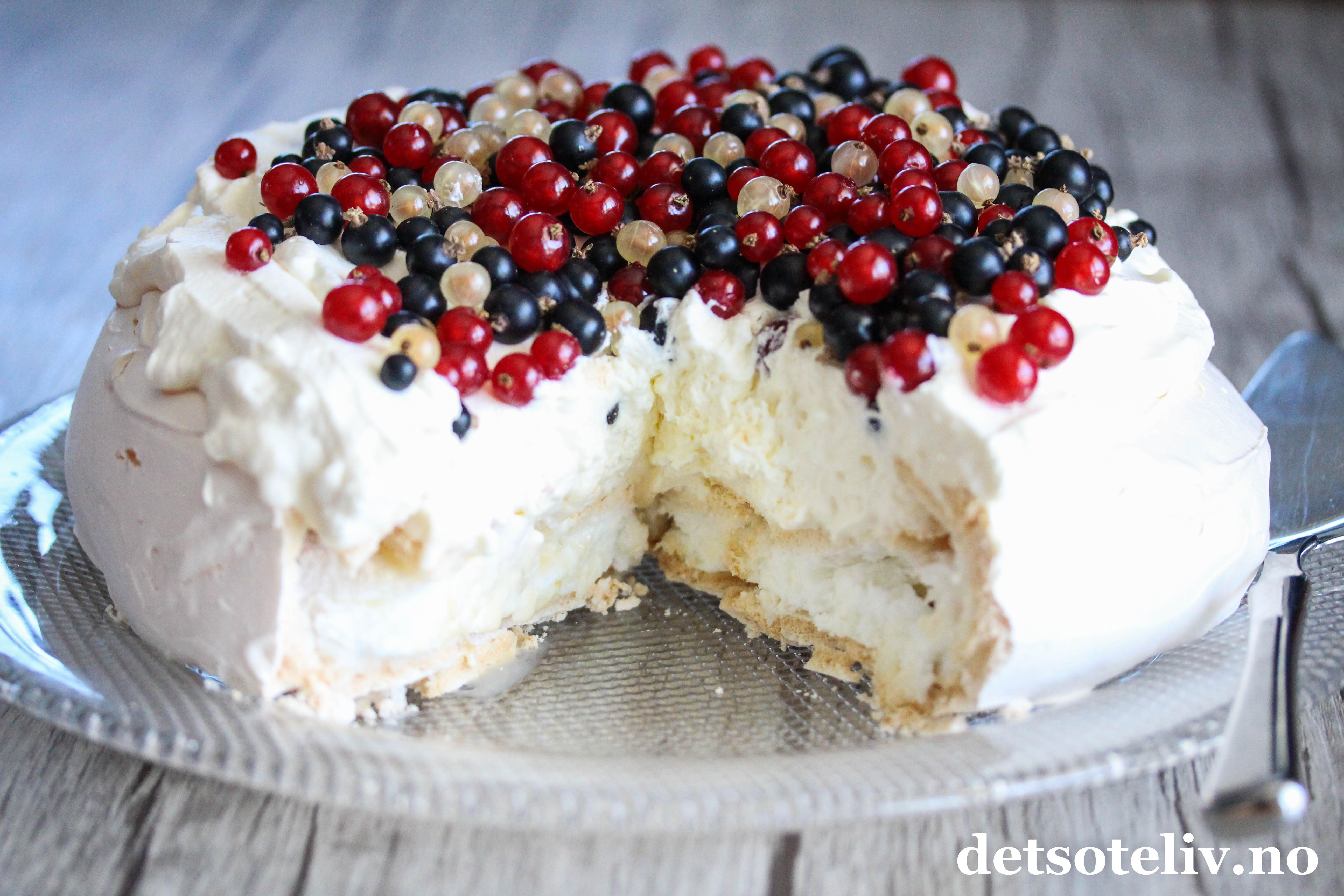 Jeg har laget en deilig, sommerlig Pavlova med rips og solbær.