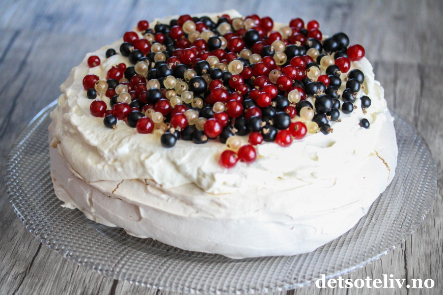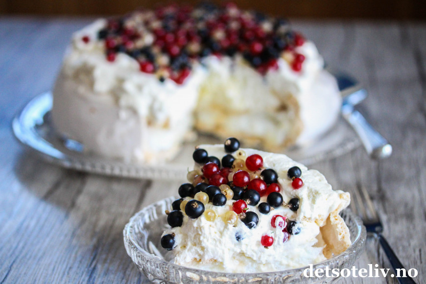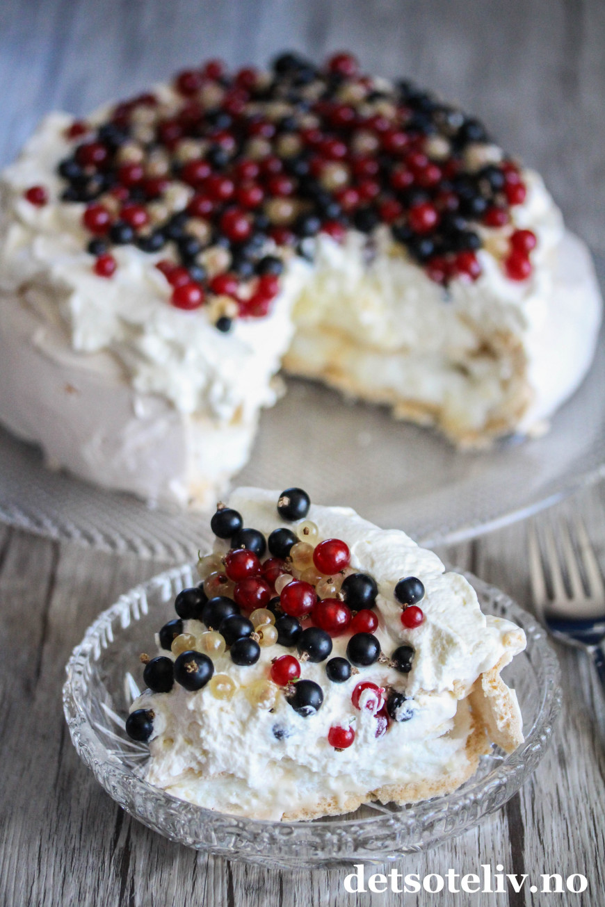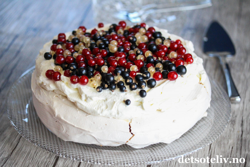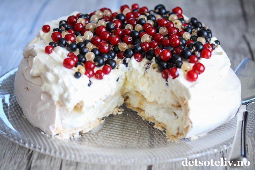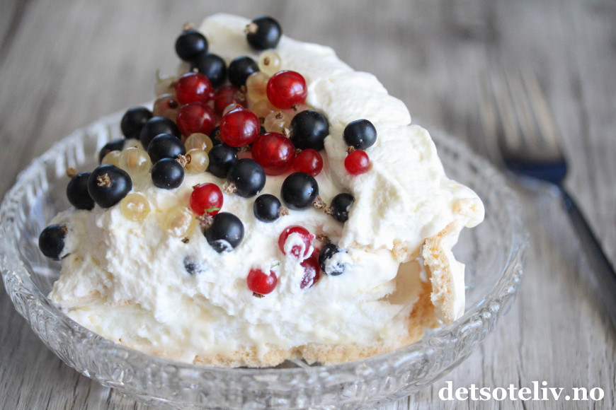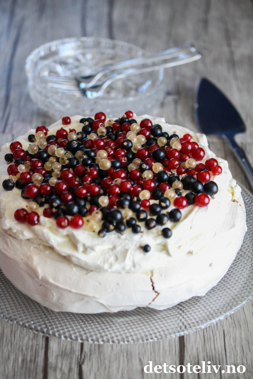 Pavlova er en internasjonalt berømt kake, men jeg tror ikke du så ofte finner en Pavlova med rips og solbær i utlandet, så dette kan vel kalles en norsk vri.